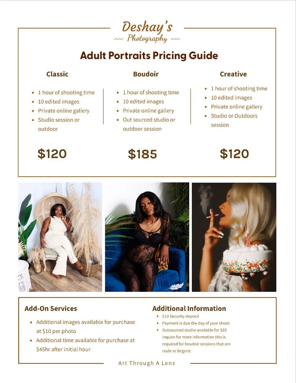 IMPORTANT INFO Please refer to pricing guides and specials for an accurate amount due at the time of your shoot these are just estimates and deposits when you book I will reach out personally before your booking is officially confirmed Turn around time is two weeks unless expedited Security deposit amount has changed and can vary depending on what your shoot may need deposits vary between $25-$65 if the price needs to go up after your booking I will let you know when I reach out, Thank you for understanding
